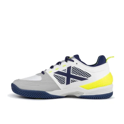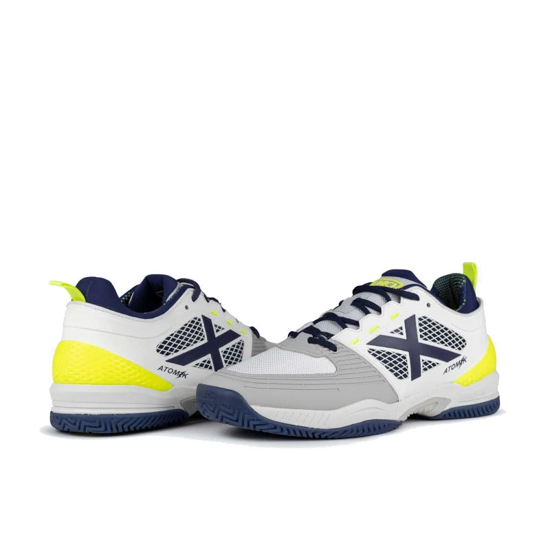 Die Munich Atomik 38 Schuhe sind die ideale Wahl für alle, die Herren-Padelschuhe suchen, die eine makellose Passform und bemerkenswerte Stabilität auf dem Platz bieten. Die Außensohle mit ihrem doppelten Fischgräten-Grip-Line-Profil sorgt für agile und sichere Bewegungen und bietet außergewöhnlichen Grip und hervorragende Traktion. Drehpunkte an der Sohle verbessern die Agilität und flüssigen Bewegungen bei Drehungen, während die GEL-Technologie in der Ferse optimale Dämpfung bei Richtungswechseln, Landungen und intensiven Bewegungen bietet. Das Obermaterial dieser Schuhe besteht aus einem gummierten Gewebe und strapazierfähigem Mesh, das an den besonders beanspruchten Stellen verstärkt ist und so für Atmungsaktivität und Halt sorgt. Die Zehenkappe ist mit einem TPU-Einsatz versehen, der die Abriebfestigkeit erhöht.