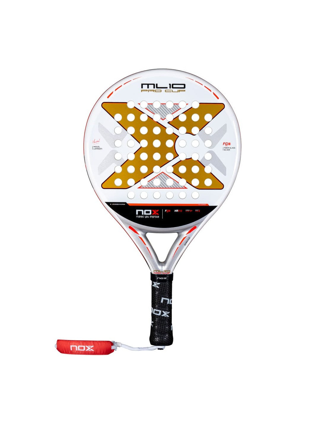 Pure Wettkampfstärke: Der Nox ML10 PRO CUP COORP - Miguel Lamperti Padelschläger ist auf Sieg ausgelegt. Seine runde Form und die Konstruktion aus Nox-Materialien sorgen für Power, Kontrolle und Selbstvertrauen in jedem Match. Das Design in Weiß, Gold und Rot unterstreicht seinen Siegercharakter. Empfohlen für fortgeschrittene Spieler, die sich von der Masse abheben wollen.