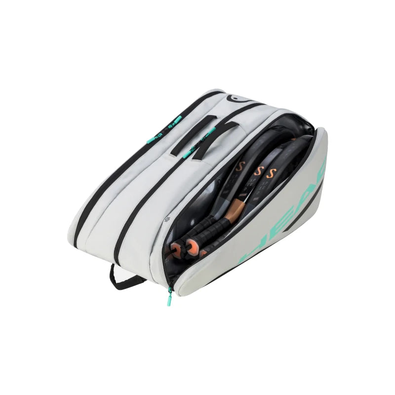 - New shape with new padding for greater stability - New top handles - Three main compartments with space for up to 7 rackets - CCT+ climate control technology in a compartment - Integrated shoe compartment - Interior and exterior zip pockets - Backpack type transport system - Choice of modern color combinations - Hang tag made with recycled paper and hemp cord - Presented in a new recycled plastic bag - Two racket compartments - A CCT+ racket compartment - One main compartment - A shoe compartment - An exterior zip pocket for accessories - An interior accessory pocket